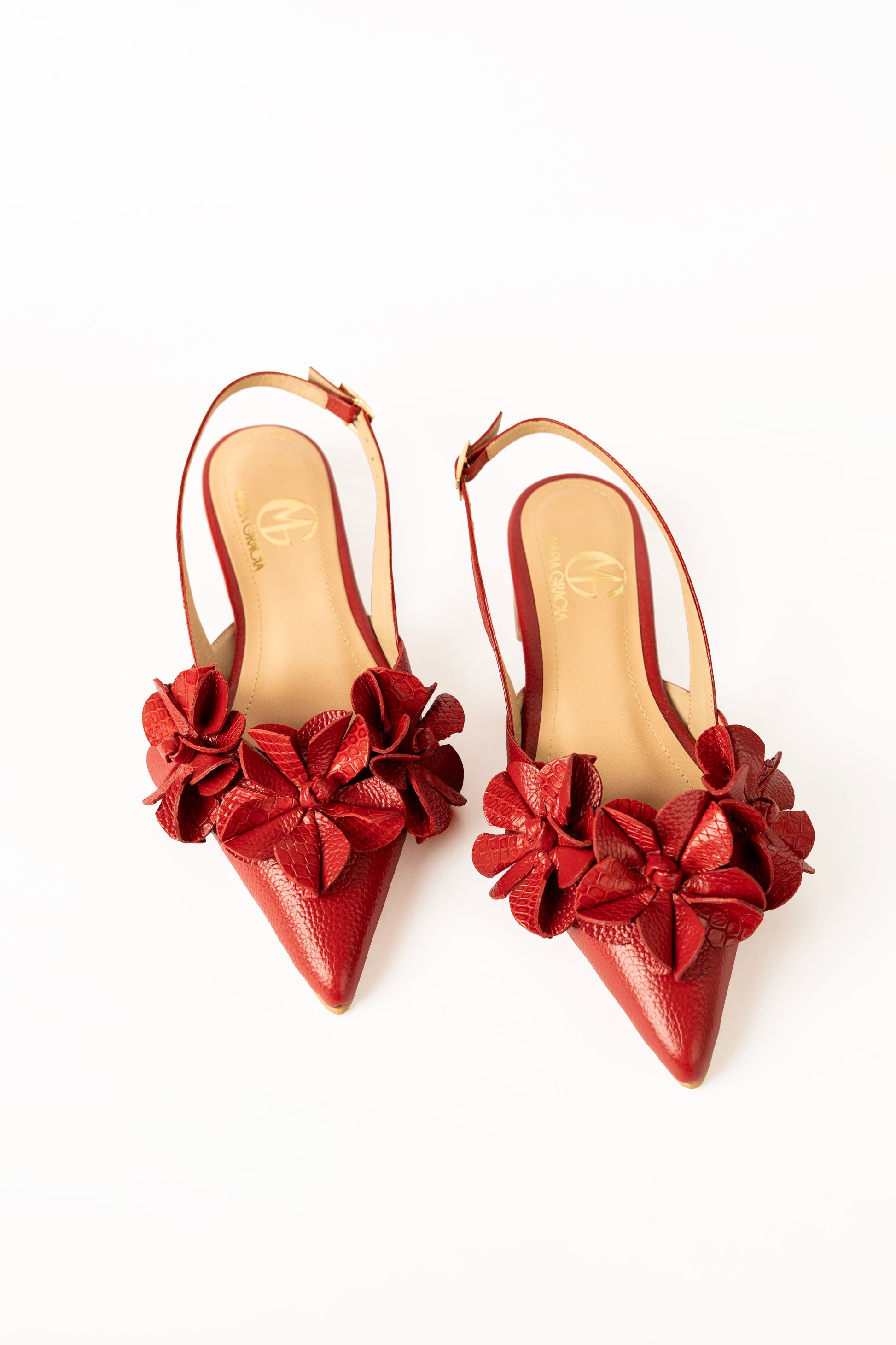 Flat Mules en cuero con flor elaborada a mano, Horma puntuda. Tienen la planta muy acolchada para mayor confort.