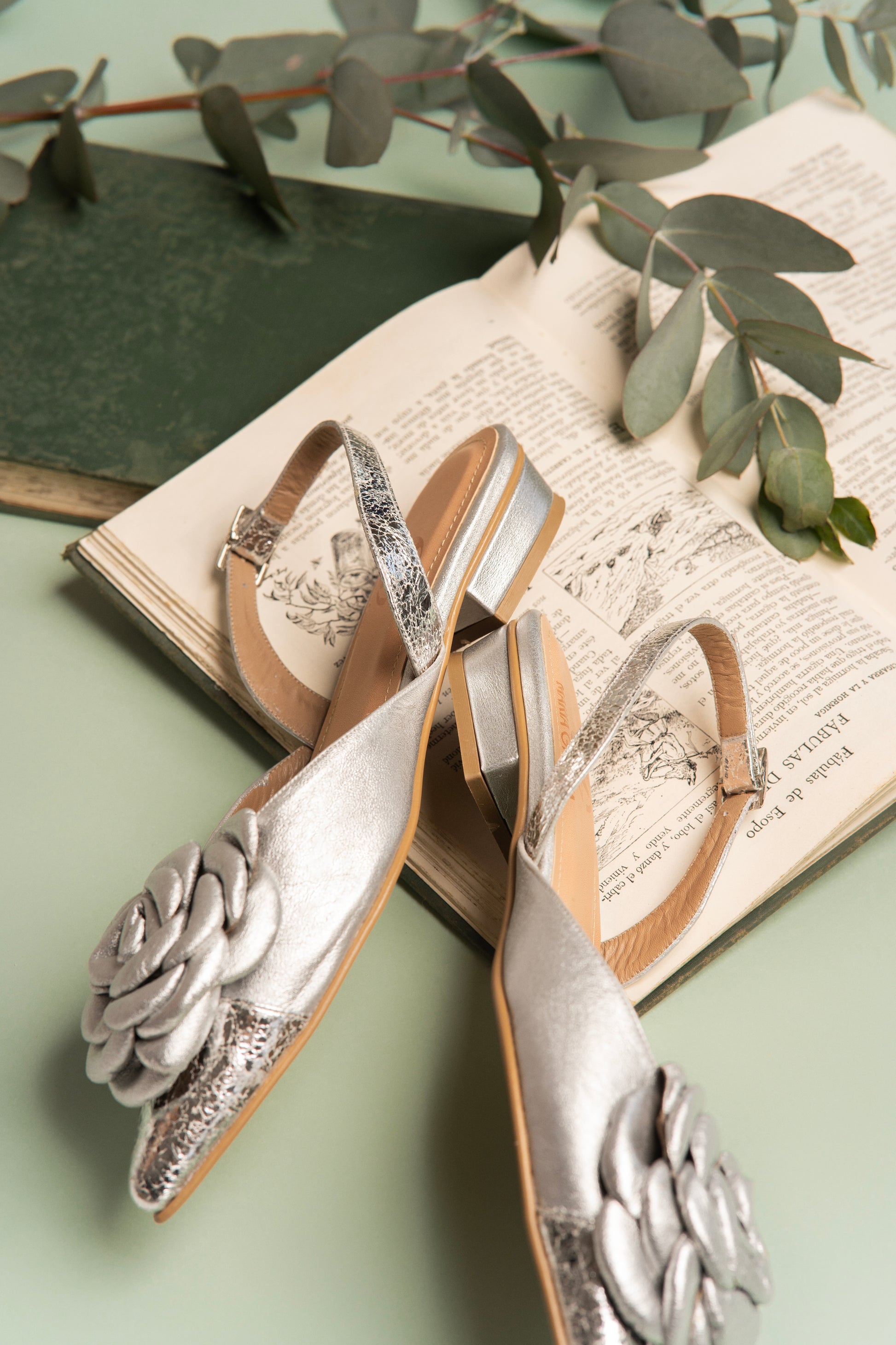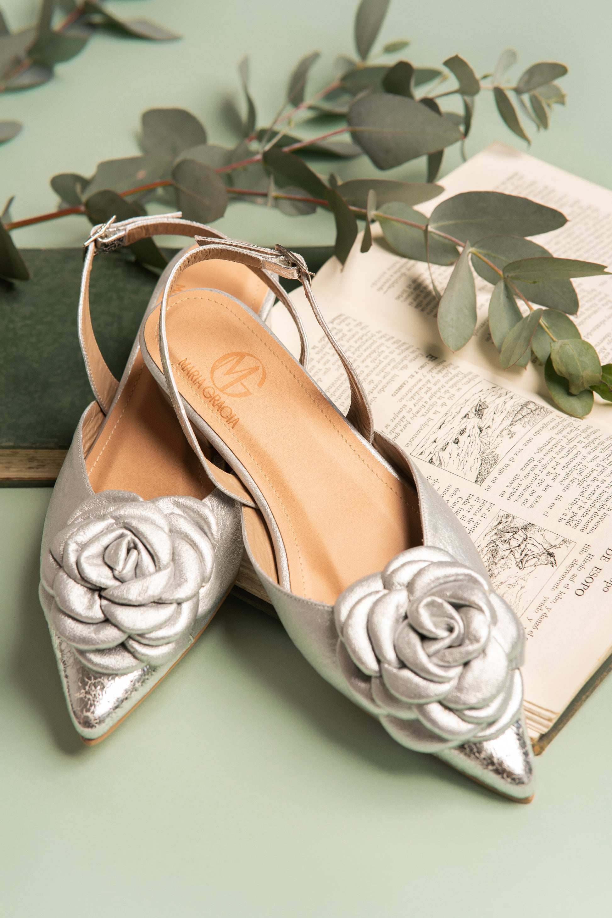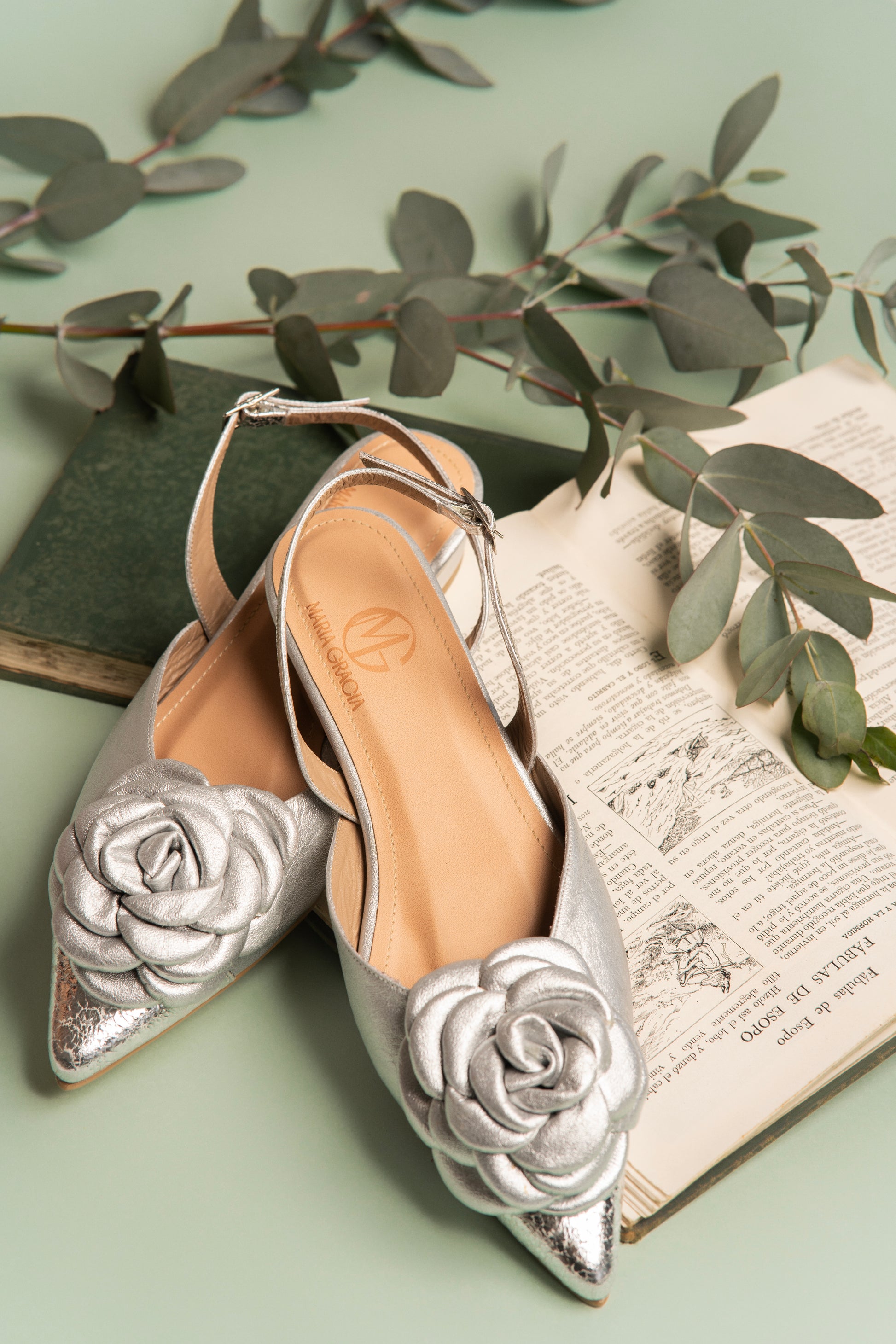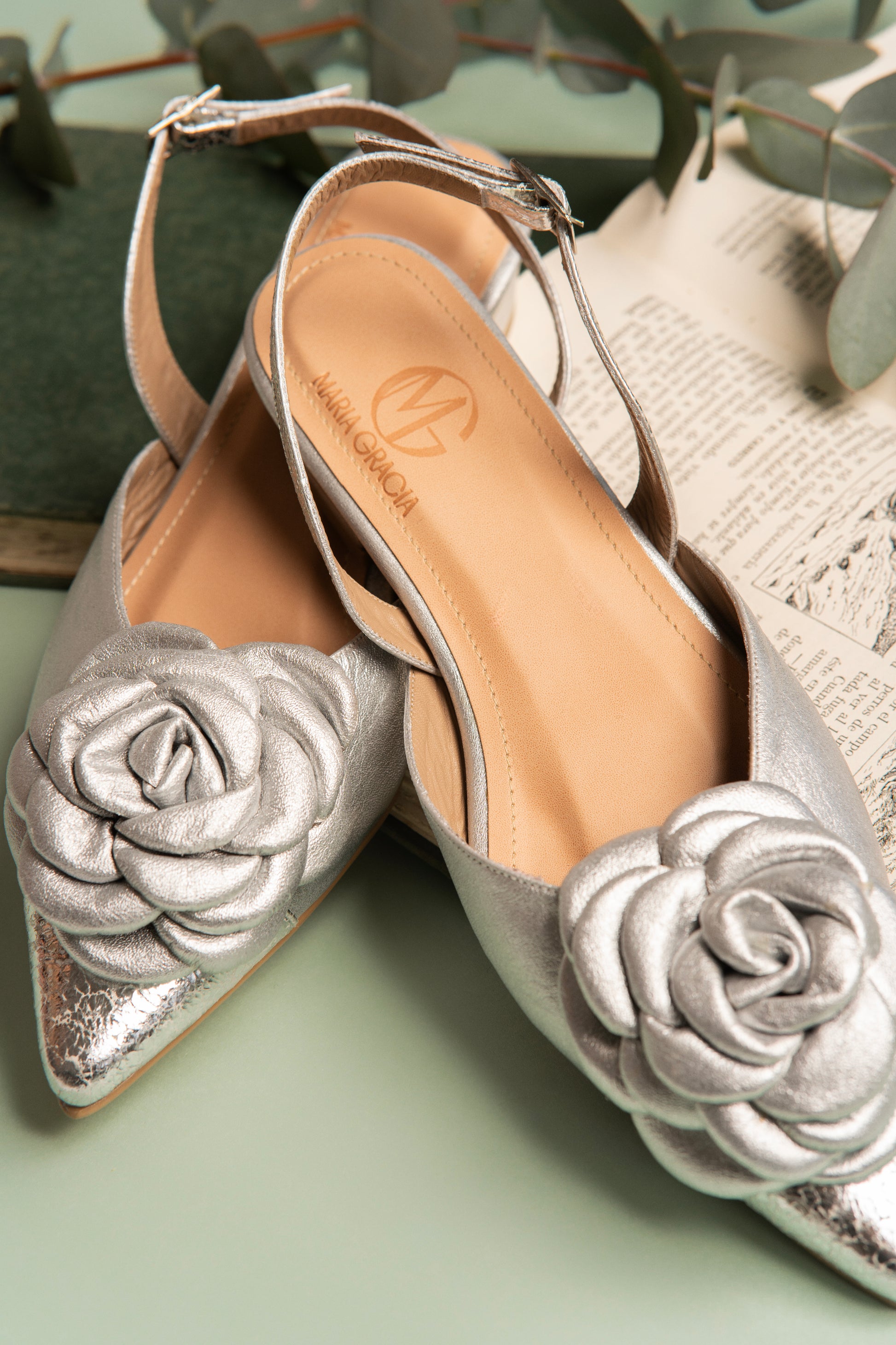 Flat Mules en cuero plata, puntudos, con talón, con detalle de flor en cuero elaborada a mano. Tienen la planta muy acolchada para mayor confort.