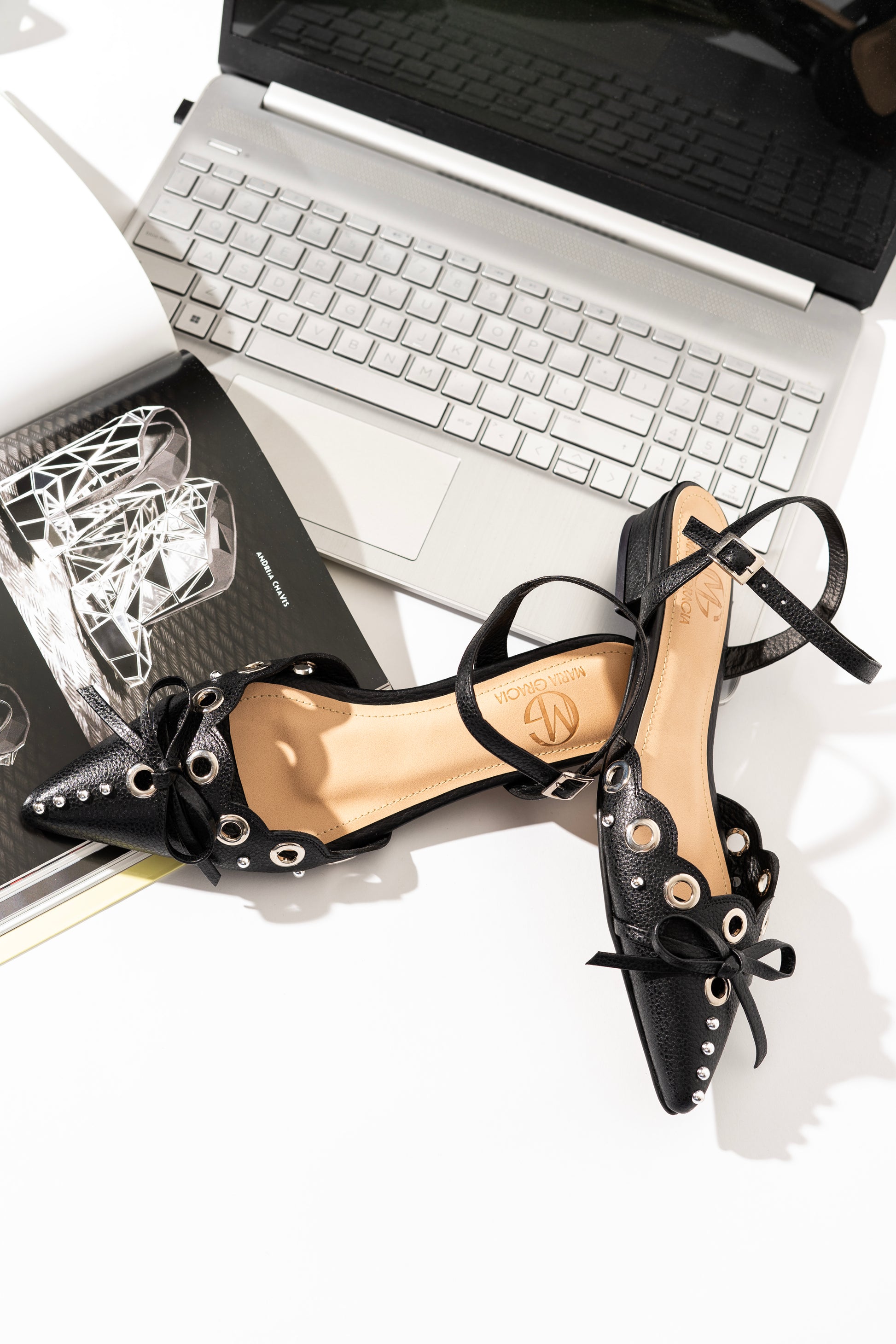 Flat Mules en cuero  puntudos, con talón. Detalle de taches. Tienen la planta muy acolchada para mayor confort.